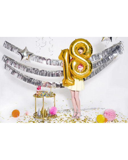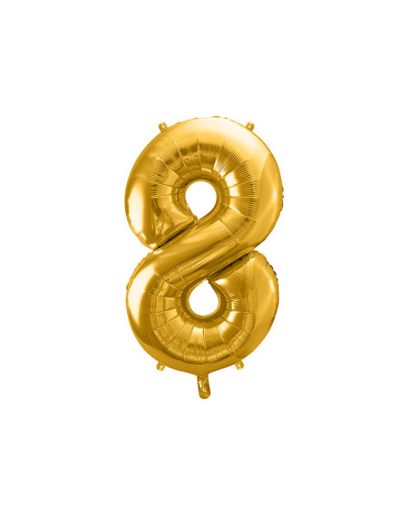 Balon foliowy metalizowany Cyfra ''8'' w kolorze złotym, rozmiar przed napompowaniem ok. 100 cm (39''), rozmiar po napompowaniu ok. 86 cm (34''). Do napomowania powietrzem i helem.