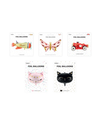 Zestaw balonów foliowych zawiera: 5x Balon foliowy Samolot, 91x39cm, mix (1 op. / 1 szt.), 5x Balon foliowy Auto, 111x63 cm, mix (1 op. / 1 szt.), 5x Balon foliowy Kotek, 48x36cm (1 op. / 1 szt.), 5x Balon foliowy Kotek, 48x36cm, czarny (1 op. / 1 szt.), 5x Balon foliowy Motyl, 120x87 cm, mix (1 op. / 1 szt.) (1 op. / 25 szt.).