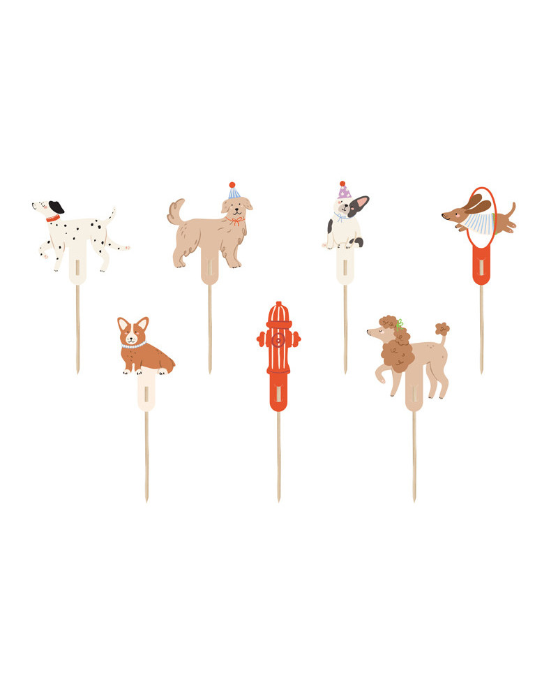 Dekoracje papierowe do muffinek Pieski i hydrant, mix kolorów, wymiary pojedynczych papierowych elementów: ok. 7,3-9,6 cm, wysokość drewnianych patyczków: 10 cm, wysokość całkowita ok. 17,3 cm i 19,6 cm. Zestaw zawiera 7 dekoracji i 7 patyczków. Produkt do samodzielnego złożenia. Sposób montażu: papierowy kształt nasunąć na drewniany patyczek w miejscu rozcięcia. (1 op. / 7 szt.). Uwaga. Tylko do dekoracji. Do kontaktu z żywnością przeznaczony jest wyłącznie patyczek.