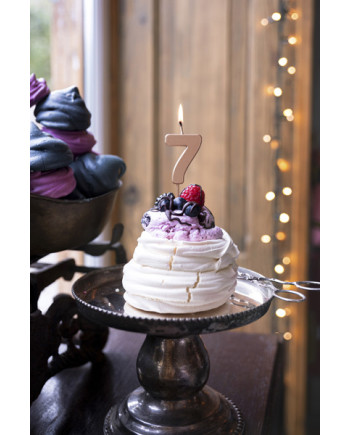 Świeczka urodzinowa Cyferka 7 w kolorze różowego złota na drewnianym patyczku, wysokość cyfry ok. 4.5 cm, wysokość całkowita ok. 9 cm. Dopuszczony do kontaktu z żywnością jest patyczek. Uwaga. Trzymać z dala od dzieci i zwierząt. Trzymać z dala od rzeczy, które mogą się zapalić. Nigdy nie zostawiaj płonącej świecy bez nadzoru. Do kontaktu z żywnością przeznaczony jest wyłącznie patyczek.